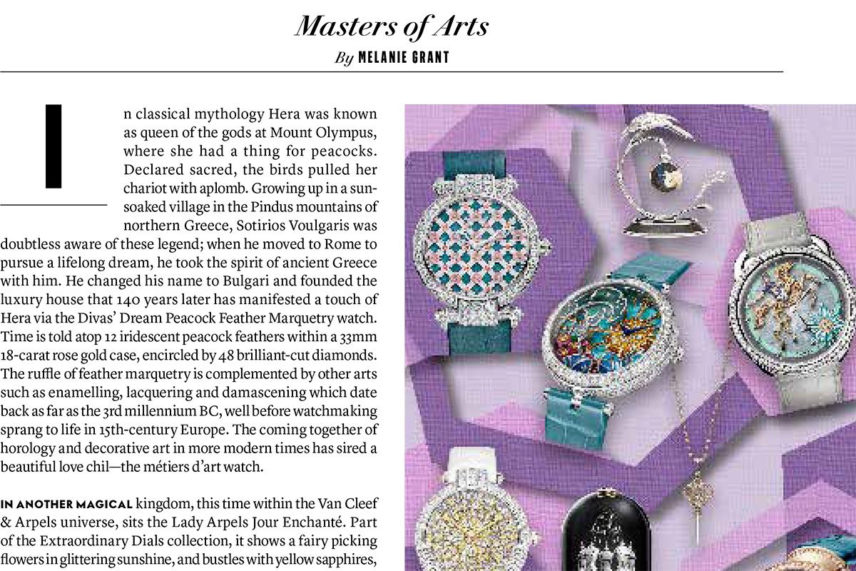 The merging of art, history and poetry in metier d’art watches is reaching epic proportions this year and at Louis Vuitton, the Age of the Samurai is providing ample inspiration for their new Tambour Bushido Automata which counts enamelling and engraving within its repertoire with a mechanical calibre animating the central character’s expression flanked by Mount Fuji. On a gentler note, at Van Cleef & Arpels, lovers coquettishly flirt on a modern-day bridge kissing at midnight for The Pont des Amoureux Matinée watch brought together by a double retrograde and on-demand animation mechanism. Grisaille enamel with the soft wash of a watercolour palette articulates a background scene illuminated by the moon as blue sapphires twinkle on the bracelet.